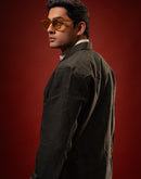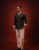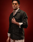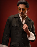 This Obsidian Verde (Deep Green) men's jacket is made from 100% pure linen with a fine 25 lea weave, combining the elegance of a royal Maharaja-inspired safari style with a contemporary silhouette. Designed for all-weather comfort, its breathable fabric is ideal for summer while adaptable to cooler conditions. Finely tailored with a discreet size adjustment hook, the jacket offers a sharp, blazer-like fit that can be customized for a polished appearance. It seamlessly blends traditional sophistication with modern versatility for the discerning wearer.