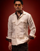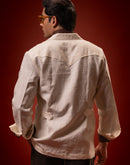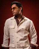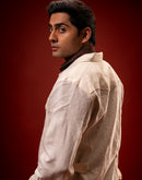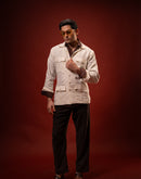 This Pure Alabaster (Off White) men's jacket is made from 100% pure linen with a fine 25 lea weave, combining the elegance of a royal Maharaja-inspired safari style with a contemporary silhouette. Designed for all-weather comfort, its breathable fabric is ideal for summer while adaptable to cooler conditions. Finely tailored with a discreet size adjustment hook, the jacket offers a sharp, blazer-like fit that can be customized for a polished appearance. It seamlessly blends traditional sophistication with modern versatility for the discerning wearer.